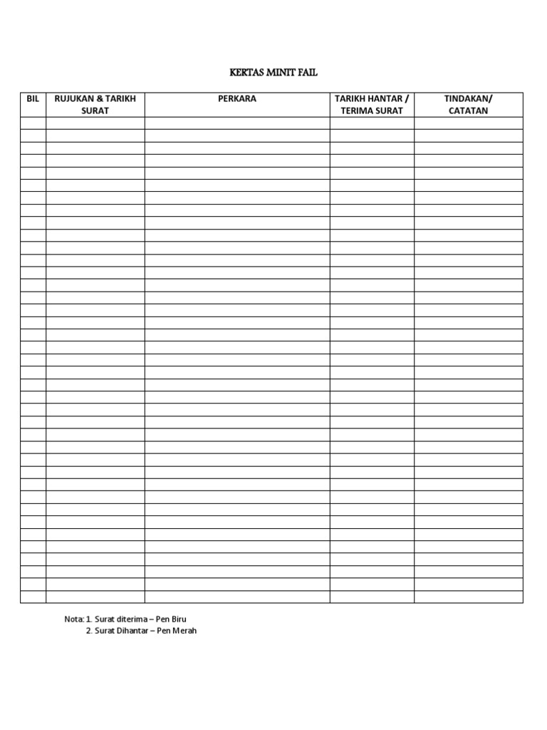 User Last modified by. Kakitangan memasukkan minit tersebut ke dalam fail jika. KERTAS MINIT Mengandungi senarai surat yang masuk dan keluar dengan memberi nombor rujukan Biasanya menggunakan warna dakwat yang berbeza untuk membezakan surta masuk dan surat keluar Surat yang diterima dicatatkan dengan dakwat merah pada kertas minit manakala surat yang dikirimkan keluar ditulis dengan dakwat biru.